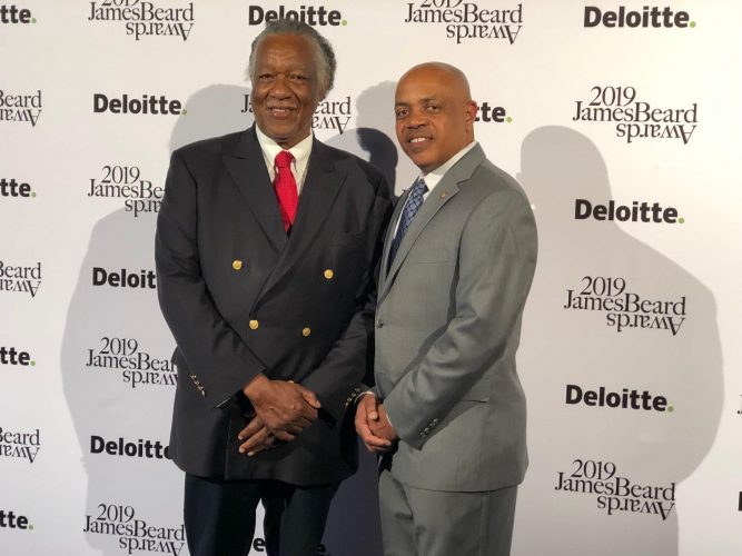 “I think this James Beard Leadership Award is a vehicle, a vehicle for us to talk together, a vehicle for us to collaborate together, but a vehicle for us to truly change the full system.” — 2019 honoree Cornelius Blanding (right) standing with Ben Burkett, inductee of the Co-op Hall of Fame.